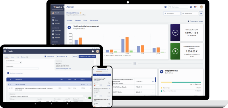 Dès l’écran d’accueil, doté de widgets personnalisables, j’accède instantanément à mes indicateurs clés : statut des devis, facturation, chiffre d’affaires. De son côté, ma conjointe pilote le planning et les fiches clients avec la même visibilité. Nous disposons ainsi de données fiables et d’indicateurs de performance pour piloter sereinement l’activité sur le terrain comme au quotidien. La fiabilité des chiffres constitue d’ailleurs un point fort : les données issues de TOMAS correspondent au centime près aux éléments validés par notre expert-comptable lors du bilan annuel.
